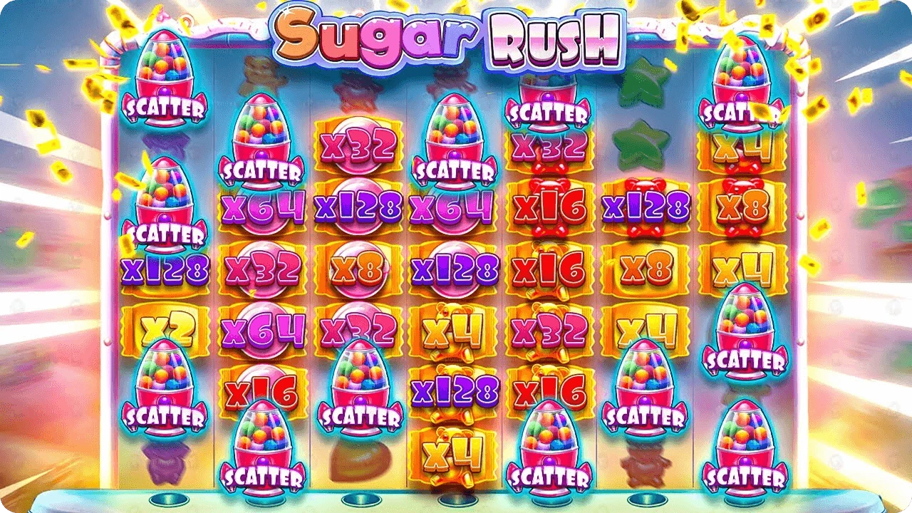 🍪 Scatter (Леденец): символ, активирующий бесплатные вращения. Он не участвует в формировании кластеров, но при выпадении 3 и более запускает бонусный раунд. Именно в бонусе раскрывается настоящий потенциал игры Sugar Rush, когда в дело вступают липкие множители.